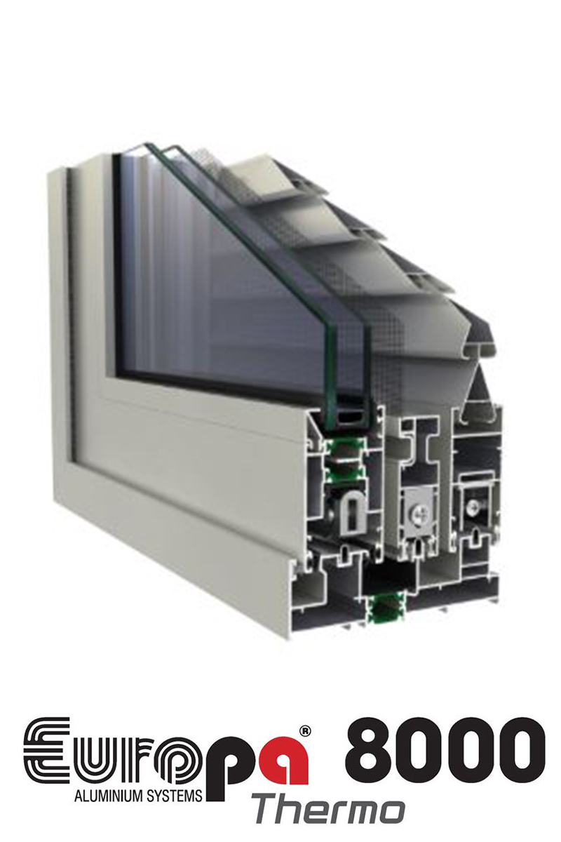 Η σειρά EUROPA 8000 Thermo είναι ένα νέο οικονομικό, θερμομονωτικό συρόμενο σύστημα υψηλών προδιαγραφών με απλές ίσιες γραμμές σχεδίασης. Σχεδιάστηκε για να δημιουργεί συρόμενα κουφώματα προσφέροντάς τους απόλυτη μόνωση από κάθε ήχο και θερμοκρασία, με έμφαση την σύγχρονη αισθητική και λειτουργικότητα.